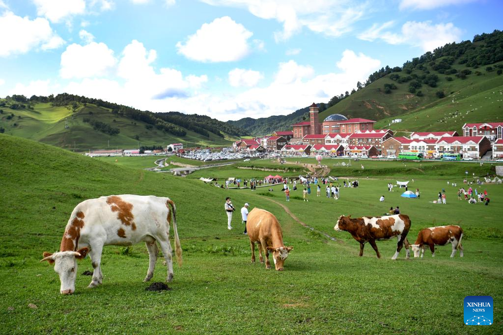 This photo taken on Aug. 3, 2024 shows people visiting the Guanshan grassland scenic area in Longxian County of Baoji City, northwest China's Shaanxi Province. Baoji, facing Qinling mountains in the south, loess terrace in the north, with Weihe River flowing through the city from west to east, has made great efforts in its ecological management and green development in recent years. (Xinhua/Zou Jingyi)