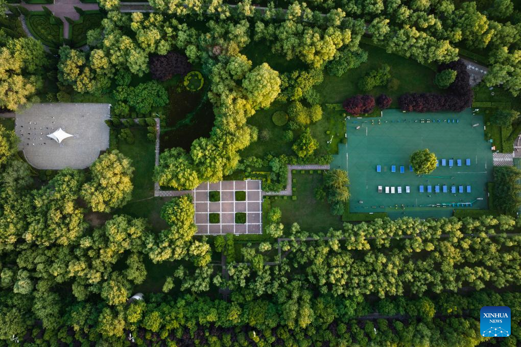 An aerial drone photo taken on May 28, 2025 shows people visiting the Weihe ecological park in Baoji City, northwest China's Shaanxi Province. Baoji, facing Qinling mountains in the south, loess terrace in the north, with Weihe River flowing through the city from west to east, has made great efforts in its ecological management and green development in recent years. (Xinhua/Zou Jingyi)