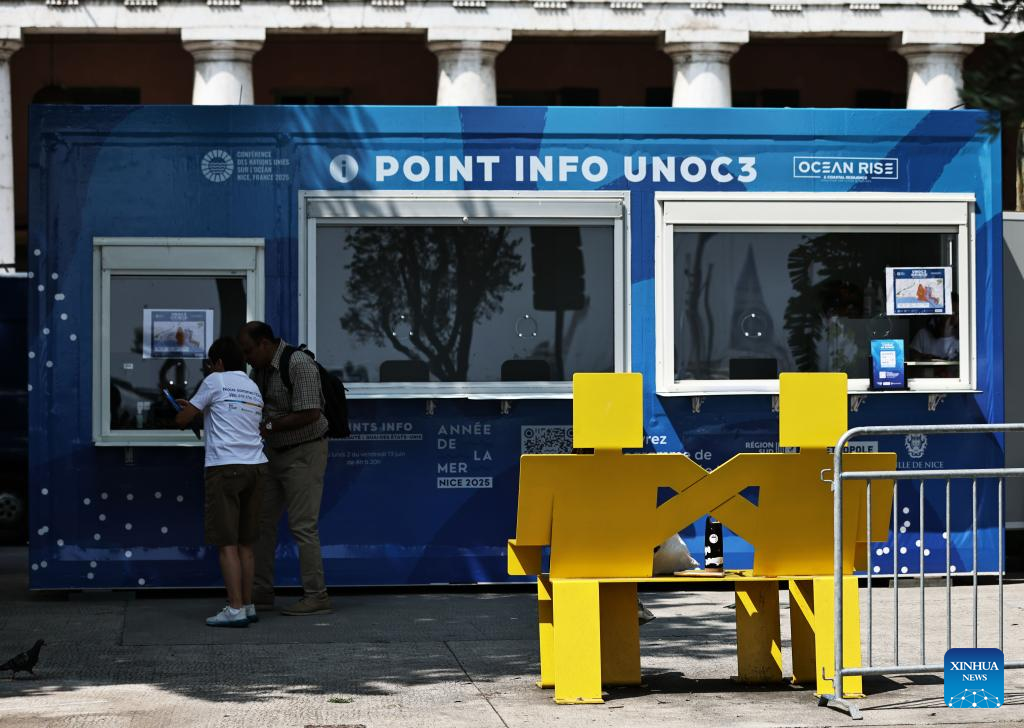 People learn about the third United Nations Ocean Conference (UNOC3) at a themed information booth on a street in Nice, France, June 10, 2025. The UNOC3 opened on Monday in Nice, a coastal city in southern France, under the theme of "Accelerating action and mobilizing all actors to conserve and sustainably use the ocean". (Xinhua/Gao Jing)