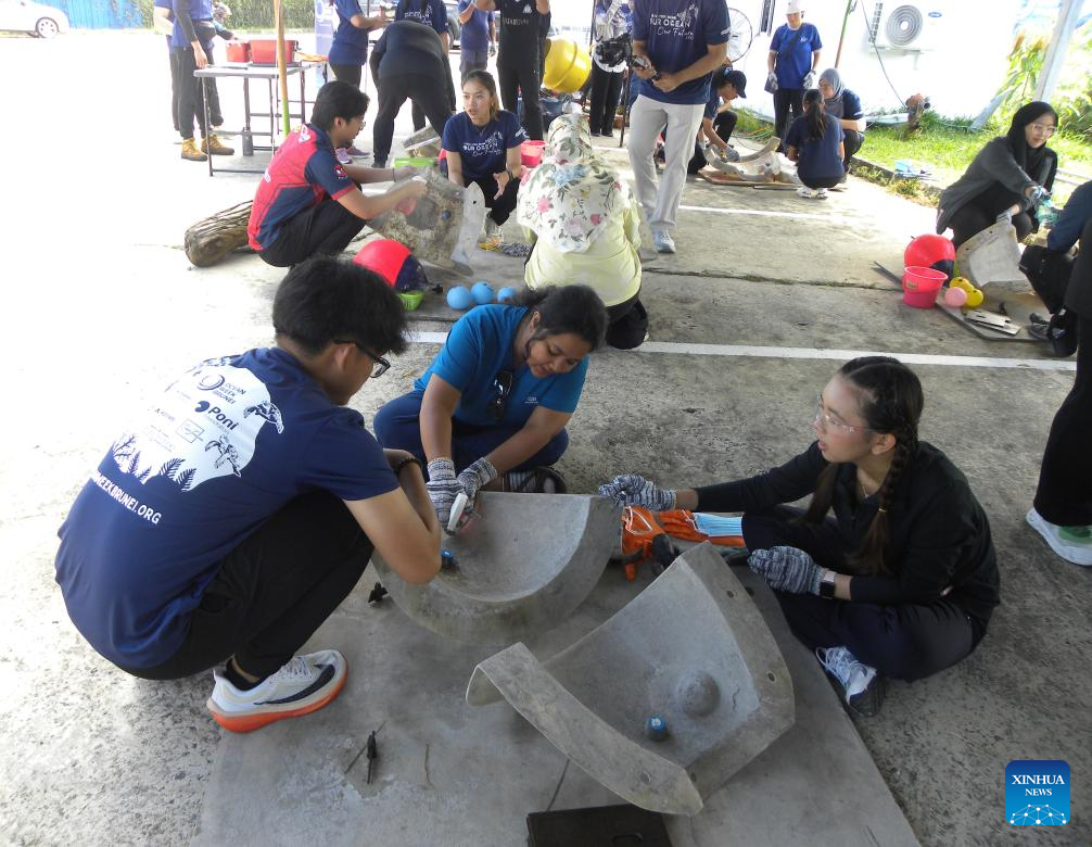 Youths take part in a reef ball fabrication activity in Bandar Seri Begawan, Brunei, on June 12, 2025. Brunei's marine habitat restoration gets a boost whereby 100 reef balls are donated to local fishermen in 2025 compared to 50 reef balls in 2024, an experienced Brunei diver said on Thursday. (Photo by Haji Norazlan Othman/Xinhua)