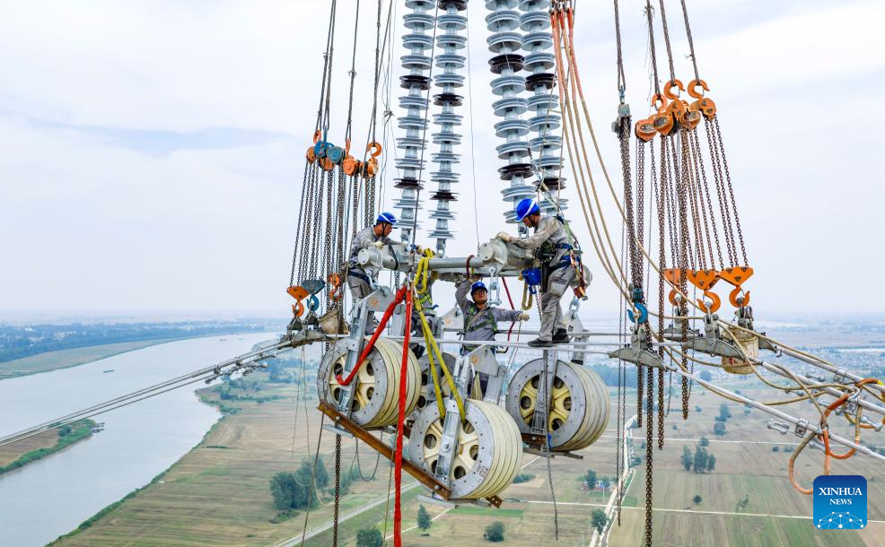 A drone photo shows staff members working on a power transmission line in Fengyang County, east China's Anhui Province, June 11, 2025. The 500 kV power transmission project from Xiangjian to Ludao in Anhui Province successfully completed the Huaihe River crossing on Wednesday. The two 193-meter towers on both sides of Huaihe River have realized a tremendous crossing distance of 1,578 meters. (Xinhua/Liu Junxi)