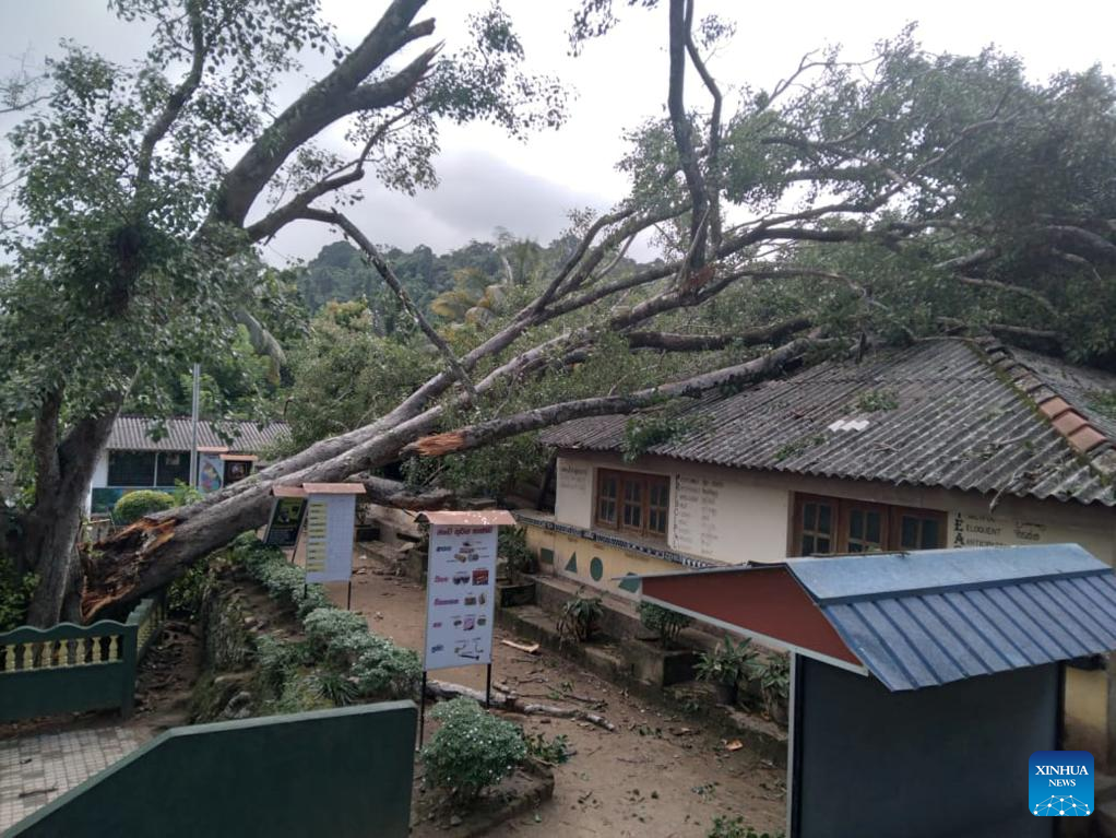 This photo taken on June 12, 2025 shows the incident site where a tree fell onto a school building in Balangoda, Sri Lanka. A student was killed and 17 others were injured after a tree fell onto a school building in Balangoda in Sri Lanka's Sabaragamuwa Province on Thursday, police reported. The deceased student was 17 years old, and the injured students have been hospitalized for treatment, according to police. Local police were conducting further investigations into the incident. (Xinhua)