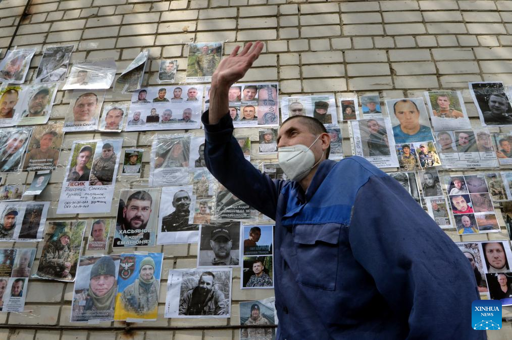 This photo shows a wall covered with images of missing Ukrainian soldiers at a medical aid facility, June 12, 2025. Ukraine and Russia on Thursday carried out the second phase of a prisoner exchange involving seriously ill and severely wounded captives, according to Ukrainian authorities.