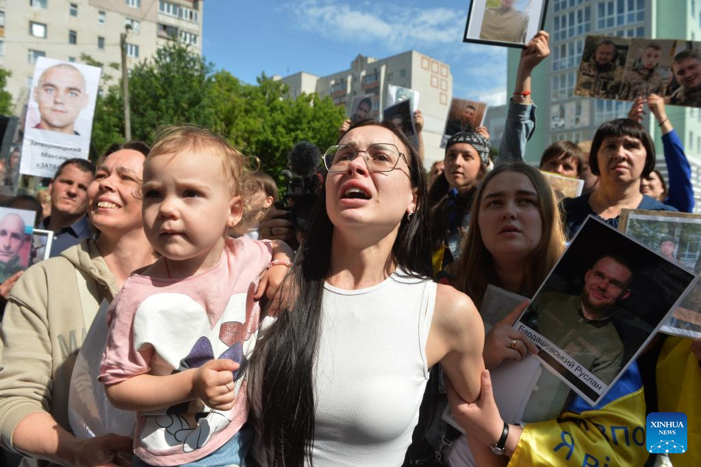 A woman holding a child calls her husband as she sees him through the window of the bus transporting released Ukrainian prisoners of war, June 12, 2025. Ukraine and Russia on Thursday carried out the second phase of a prisoner exchange involving seriously ill and severely wounded captives, according to Ukrainian authorities. Ukrainian President Volodymyr Zelensky said on Telegram that servicemen from the Ukrainian Armed Forces, the National Guard and the State Border Guard Service were among those released. The exchange is a part of a broader prisoner swap between Ukraine and Russia, which started on Monday in line with an agreement reached in Türkiye's Istanbul last week. (Photo by Peter Druk/Xinhua)