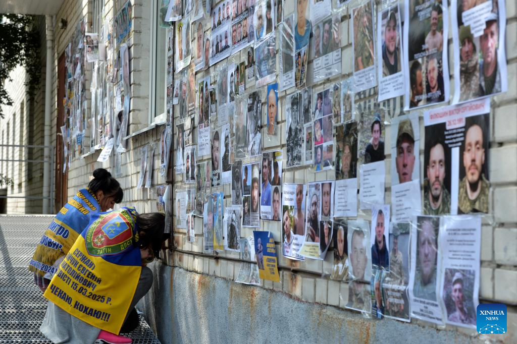 Ukrainians holding images of missing soldiers seek help outside a medical aid facility for released Ukrainian prisoners of war, June 12, 2025. Ukraine and Russia on Thursday carried out the second phase of a prisoner exchange involving seriously ill and severely wounded captives, according to Ukrainian authorities.
