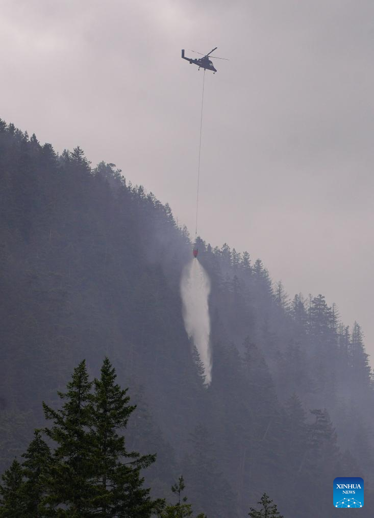 A helicopter drops water on the wildfire in Squamish, British Columbia, Canada, on June 12, 2025. Wildfire in Squamish has spread to 54 hectares in size, prompting an evacuation of the nearby area, according to BC Wildfire Service on Thursday. (Photo by Harrison Ha/Xinhua)