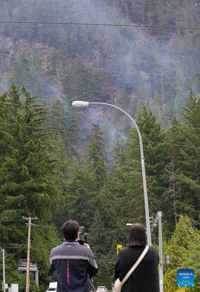 People watch the wildfire from a distance in Squamish, British Columbia, Canada, on June 12, 2025. Wildfire in Squamish has spread to 54 hectares in size, prompting an evacuation of the nearby area, according to BC Wildfire Service on Thursday. (Photo by Harrison Ha/Xinhua)