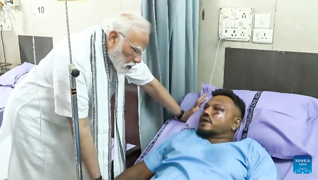 This video screenshot shows Indian Prime Minister Narendra Modi (L) visiting the only survivor in an Air India plane crash at a hospital in Ahmedabad, India's western state of Gujarat, June 13, 2025. The Indian government has launched a formal investigation into Thursday's tragic Air India plane crash, confirmed the country's Civil Aviation Minister Ram Mohan Naidu in a social media post.