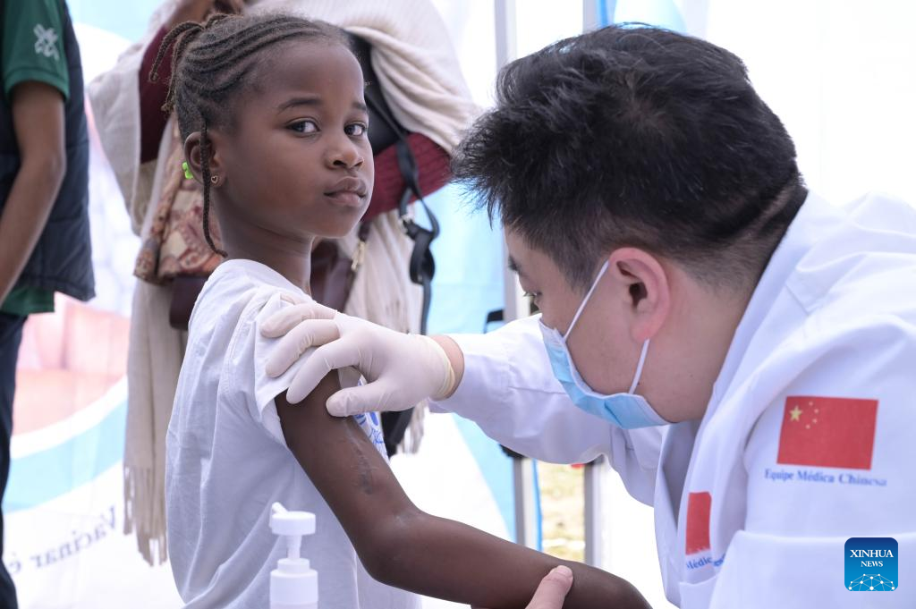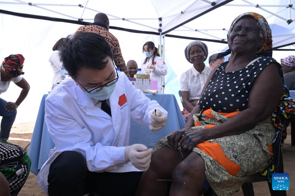 A member of the 25th Chinese medical team in Mozambique provides free medical service to a local resident in Maputo, Mozambique, June 12, 2025. (Photo by Mendes Mondlane/Xinhua)