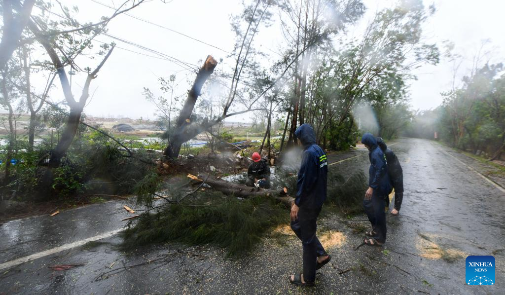 Staff members clear trees blown down by the typhoon Wutip on a highway in Ledong Li Autonomous County, south China's Hainan Province, June 13, 2025. As Typhoon Wutip continued to strengthen, the Hainan provincial meteorological service maintained a Level III typhoon alert as of 11 a.m. Friday. As of 10 a.m. on Friday, the storm's center was located over coastal waters near Ledong Li Autonomous County, with maximum sustained winds near the center reaching 28 meters per second. By 8 p.m., downpours are expected in many parts of the province. According to meteorological forecasts at noon, Typhoon Wutip is expected to move northward at a speed of 5 to 10 kilometers per hour, with little change in intensity. (Xinhua/Yang Guanyu)
