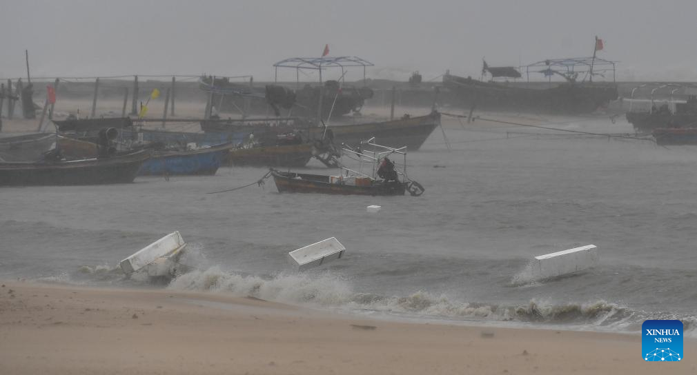 This photo taken on June 13, 2025 shows foam boxes floated on the sea in Yinggehai Town, Ledong Li Autonomous County, south China's Hainan Province. As Typhoon Wutip continued to strengthen, the Hainan provincial meteorological service maintained a Level III typhoon alert as of 11 a.m. Friday.