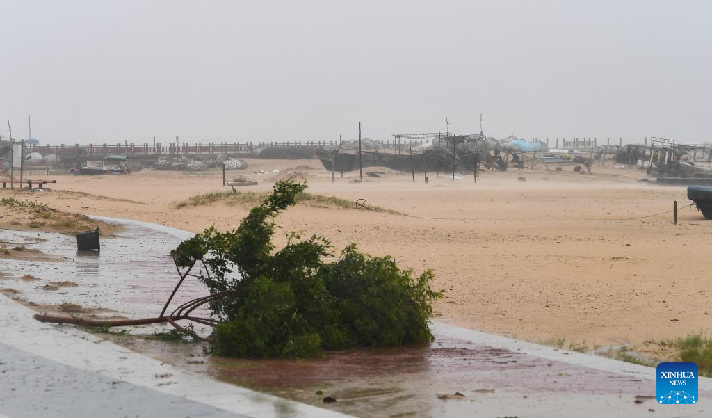 This photo taken on June 13, 2025 shows a branch blown down onto a waterfront square in Yinggehai Town, Ledong Li Autonomous County, south China's Hainan Province. As Typhoon Wutip continued to strengthen, the Hainan provincial meteorological service maintained a Level III typhoon alert as of 11 a.m. Friday.