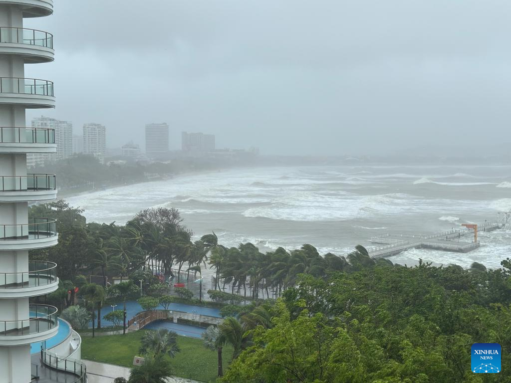 (250613) -- SANYA, June 13, 2025 (Xinhua) -- Strong winds and rough waves are seen at the Dadonghai sea area in Sanya, south China's Hainan Province, June 13, 2025. As Typhoon Wutip continued to strengthen, the Hainan provincial meteorological service maintained a Level III typhoon alert as of 11 a.m. Friday.