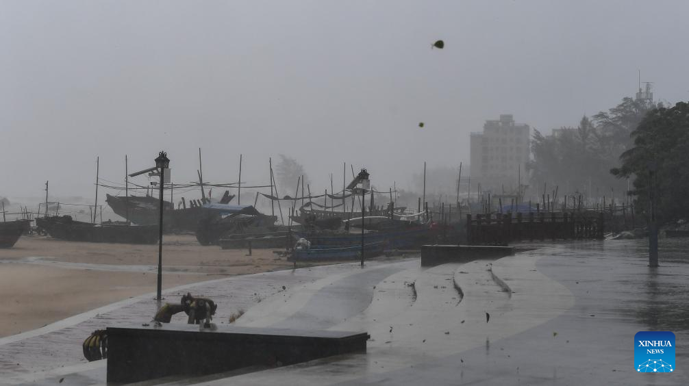 This photo taken on June 13, 2025 shows a waterfront square in Yinggehai Town, Ledong Li Autonomous County, south China's Hainan Province. As Typhoon Wutip continued to strengthen, the Hainan provincial meteorological service maintained a Level III typhoon alert as of 11 a.m. Friday.