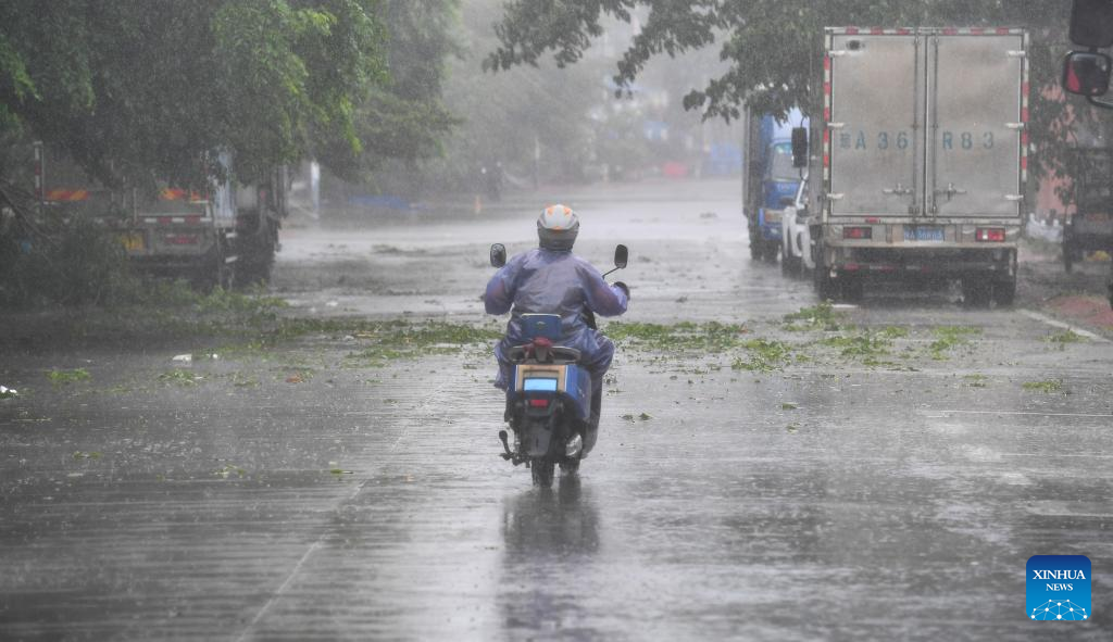 A resident rides in the typhoon in Yinggehai Town, Ledong Li Autonomous County, south China's Hainan Province, June 13, 2025. As Typhoon Wutip continued to strengthen, the Hainan provincial meteorological service maintained a Level III typhoon alert as of 11 a.m. Friday.