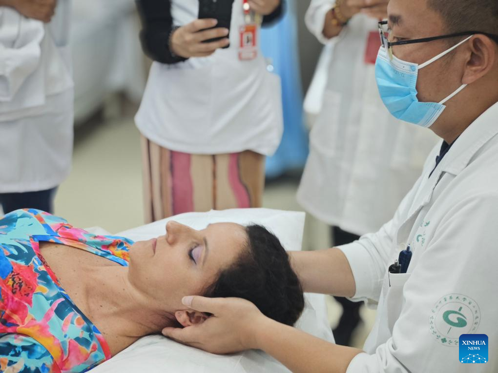 A traditional Chinese medicine (TCM) enthusiast from Brazil experiences a TCM treatment at the Second Affiliated Hospital of the Guizhou University of Traditional Chinese Medicine in Guiyang, southwest China's Guizhou Province, May 29, 2025. (Guizhou University of Traditional Chinese Medicine/Handout via Xinhua)