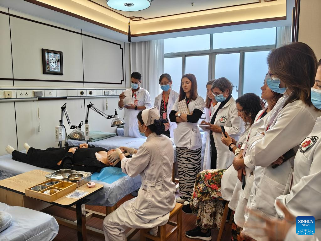 Traditional Chinese medicine (TCM) enthusiasts from Brazil observe a TCM treatment at the First Affiliated Hospital of the Guizhou University of Traditional Chinese Medicine in Guiyang, southwest China's Guizhou Province, May 30, 2025. (Guizhou University of Traditional Chinese Medicine/Handout via Xinhua)