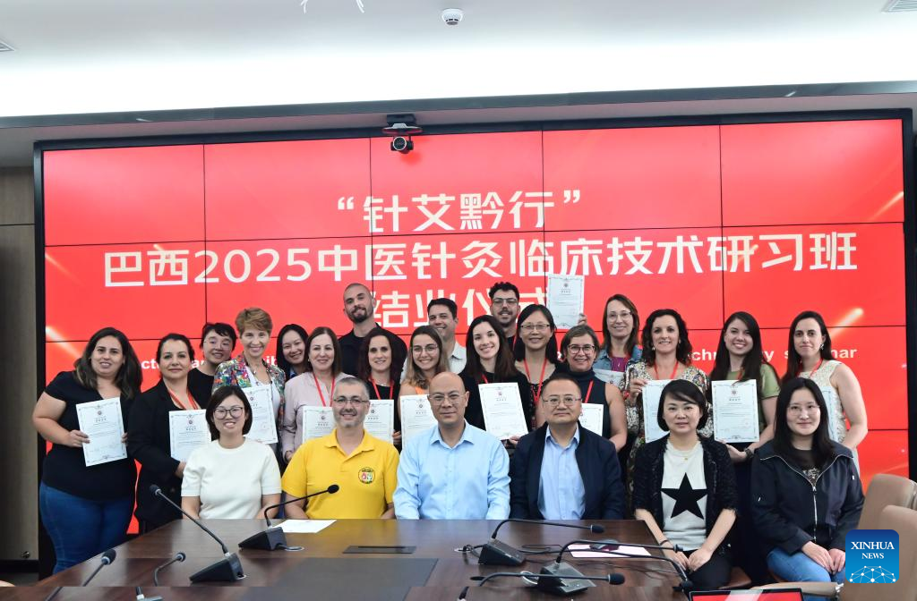 Traditional Chinese medicine (TCM) enthusiasts from Brazil pose for a group photo with their teachers after concluding a training session on TCM at the First Affiliated Hospital of the Guizhou University of Traditional Chinese Medicine in Guiyang, southwest China's Guizhou Province, May 30, 2025. (Guizhou University of Traditional Chinese Medicine/Handout via Xinhua)