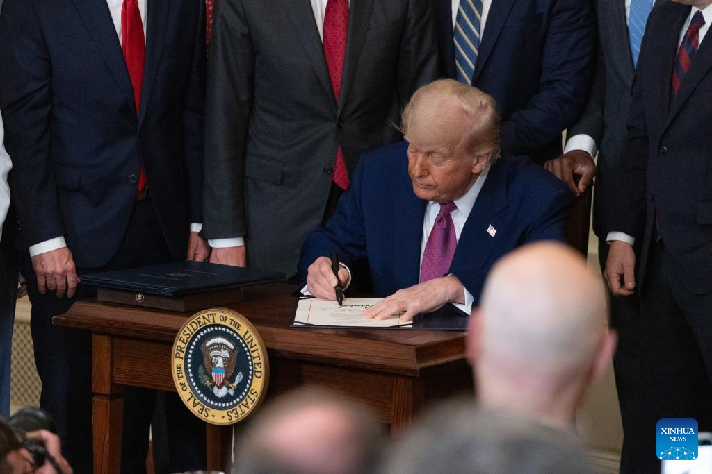 U.S. President Donald Trump signs a bill during a signing ceremony at the White House in Washington, D.C., the United States, on June 12, 2025. Trump moved on Thursday at a White House signing ceremony to eliminate California's nation-leading vehicle emissions standards, upending the strict rules that had become a template for states across the nation to realize their greenhouse gas ambitions. (Xinhua/Hu Yousong)