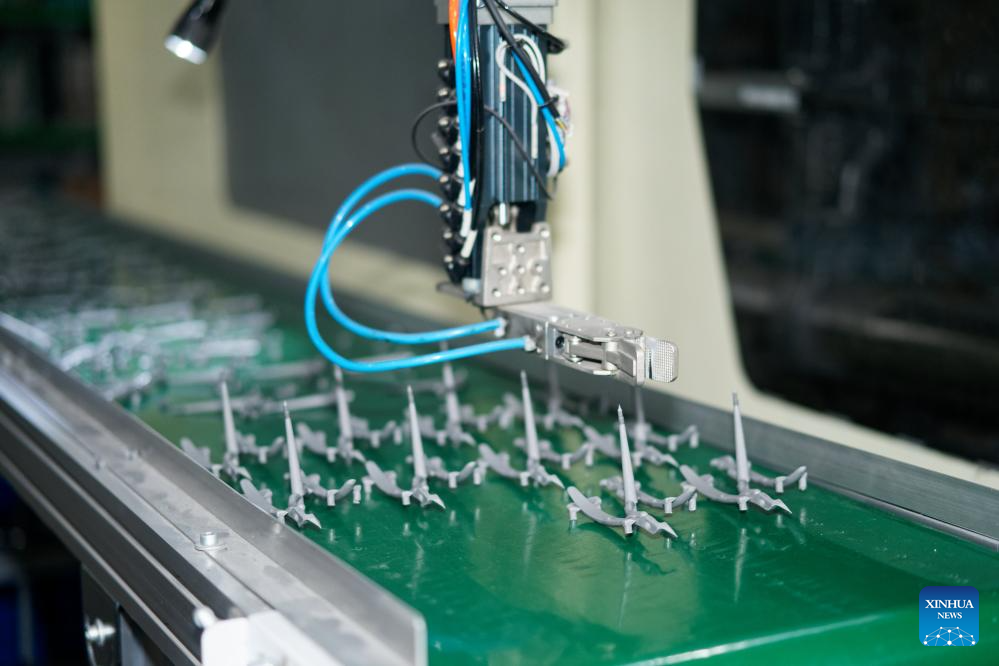 A robotic arm transfers nail clipper components onto a conveyor system at a factory in Yangjiang, south China's Guangdong Province, June 11, 2025. Yangjiang, located in south China's Guangdong, is known for its knife and scissors manufacturing. Evolving from traditional forging to intelligent manufacturing, and from original equipment manufacturing (OEM) production to building independent brand, the city's knife and scissors industry is expanding its global reach, with its products exported to over 130 countries and regions.