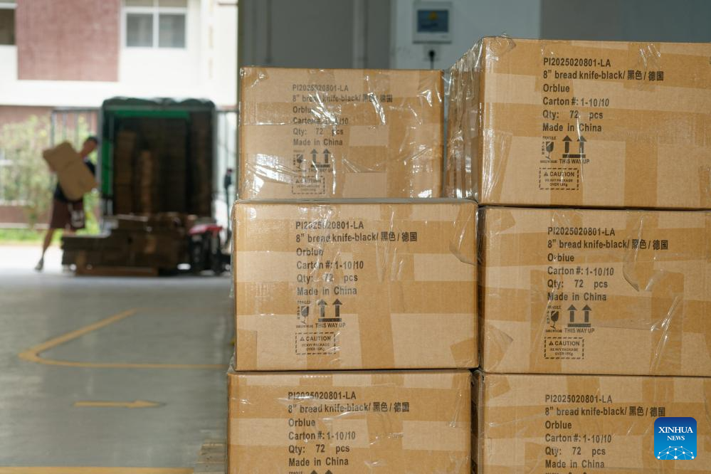 This photo taken on June 11, 2025 shows well-packed products to be exported to Germany at a knife company in Yangjiang, south China's Guangdong Province. Yangjiang, located in south China's Guangdong, is known for its knife and scissors manufacturing. Evolving from traditional forging to intelligent manufacturing, and from original equipment manufacturing (OEM) production to building independent brand, the city's knife and scissors industry is expanding its global reach, with its products exported to over 130 countries and regions.