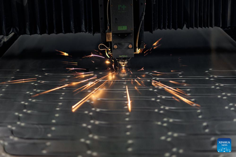 A laser machine cuts out the shape of blades on a steel plate at a factory in Yangjiang, south China's Guangdong Province, June 10, 2025. Yangjiang, located in south China's Guangdong, is known for its knife and scissors manufacturing. Evolving from traditional forging to intelligent manufacturing, and from original equipment manufacturing (OEM) production to building independent brand, the city's knife and scissors industry is expanding its global reach, with its products exported to over 130 countries and regions.