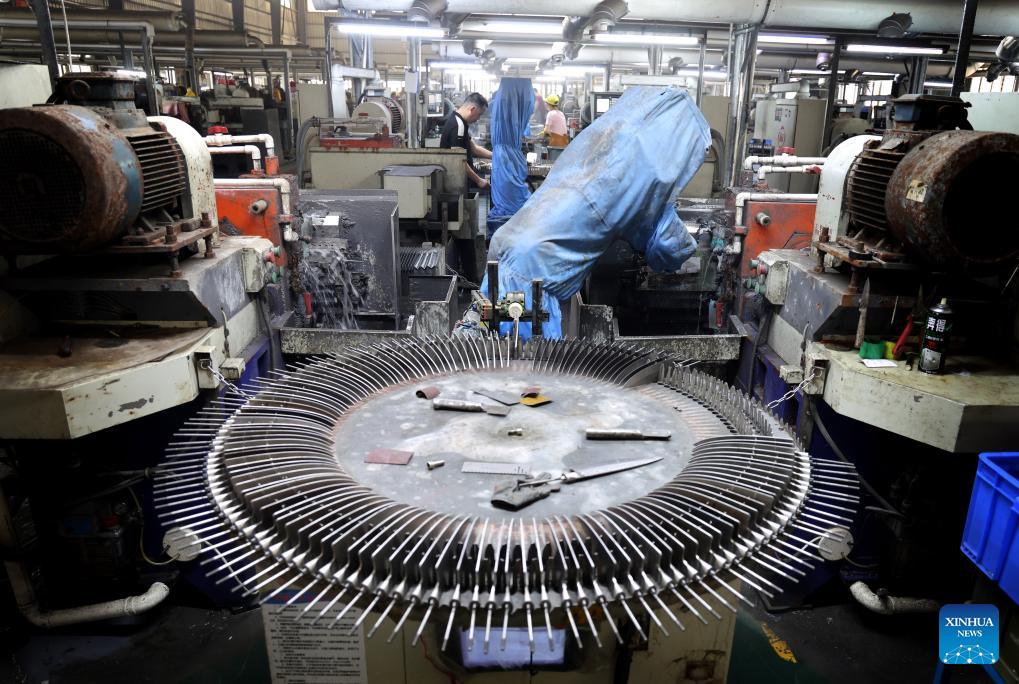 A worker puts semi-finished knives onto an automatic sandblasting machine at a factory in Yangjiang, south China's Guangdong Province, June 11, 2025. Yangjiang, located in south China's Guangdong, is known for its knife and scissors manufacturing. Evolving from traditional forging to intelligent manufacturing, and from original equipment manufacturing (OEM) production to building independent brand, the city's knife and scissors industry is expanding its global reach, with its products exported to over 130 countries and regions.