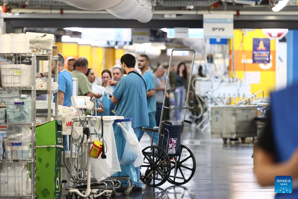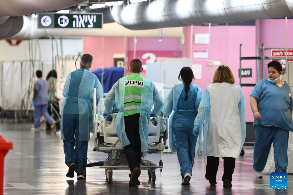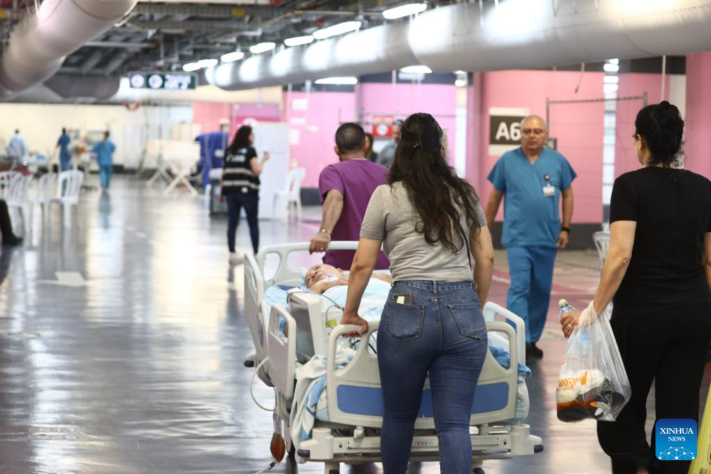 People transfer a patient at an underground ward at Rambam medical center in Haifa, northern Israel, June 13, 2025. As tensions between Israel and Iran intensified, the Rambam medical center in the city of Haifa opened its underground wards, with some patients transferred from general wards to underground to prevent missile and drone attacks. (JINI via Xinhua)