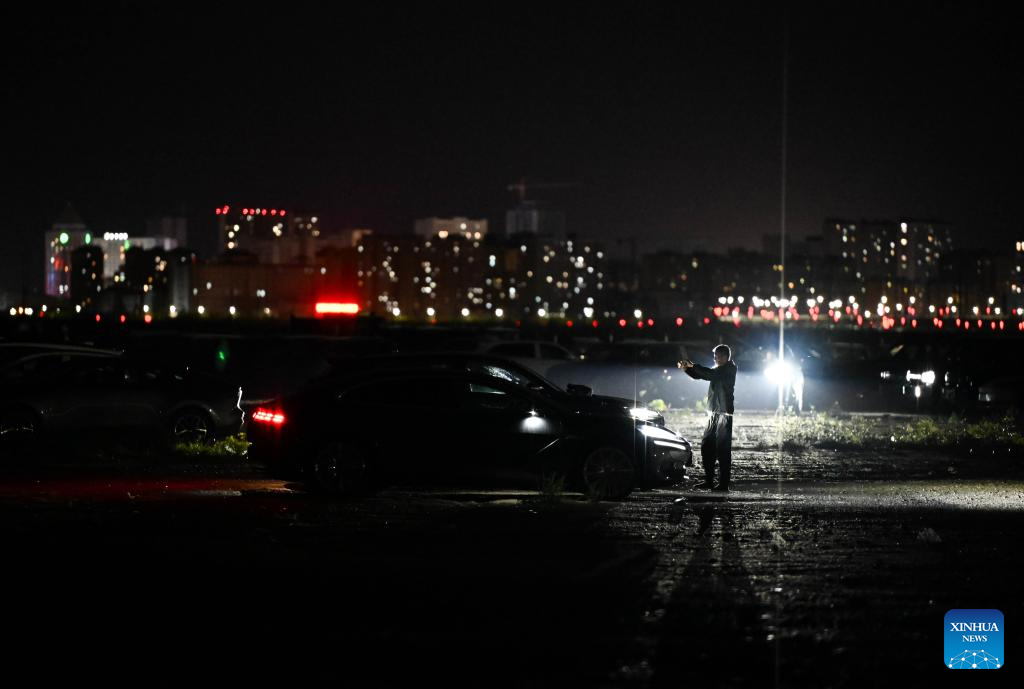Car transporter Gao Yun, driving an exported vehicle in the rain, arrives at a parking lot in the town of Zharkent, Kazakhstan, May 23, 2025. (Xinhua/Li Renzi)