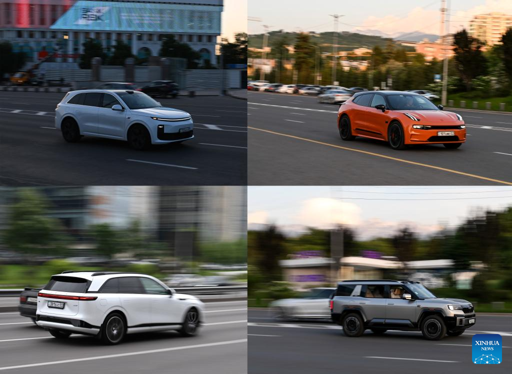 This combo photo shows Chinese new energy vehicles driving on the streets of Almaty, Kazakhstan taken on May 15, 2025 (upper L, upper R, and lower R), and taken on May 26, 2025 (lower L). (Xinhua/Li Renzi)