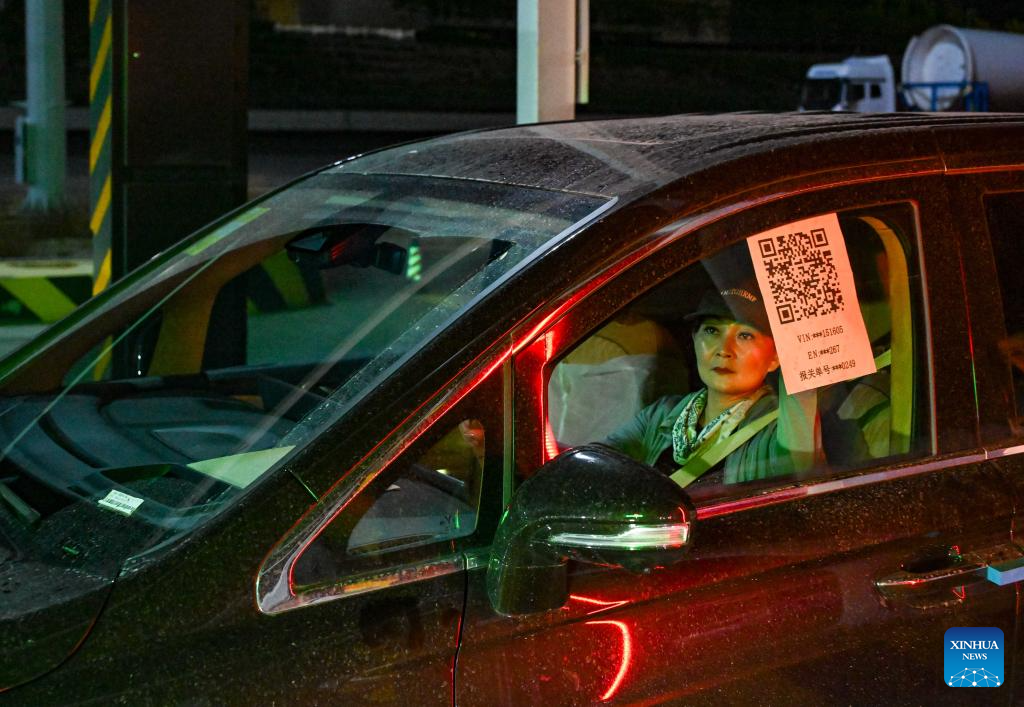 Car transporter Gao Yun scans the QR code for customs clearance at a inspection site of the road port of Horgos in Horgos, northwest China's Xinjiang Ugyur Autonomous Region, in the early morning on June 11, 2025. (Xinhua/Chen Shuo)