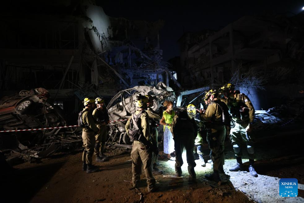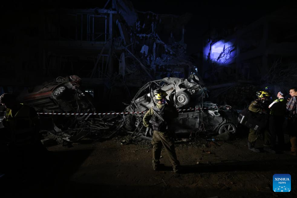 Israeli first responders arrive at a site hit by a missile fired from Iran in central Israel, on June 13, 2025. Nearly 100 missiles were launched from Iran toward central and northern Israel in two massive barrages, causing significant damage and injuring 41 people, according to the Israeli military and the national emergency service, Magen David Adom (MDA). (Photo by Jamal Awad/Xinhua)