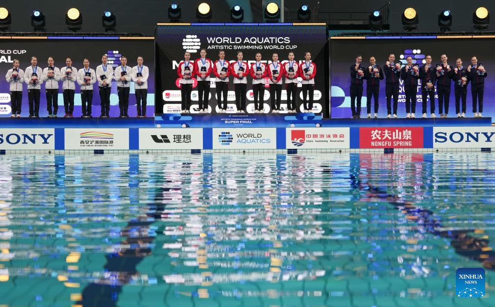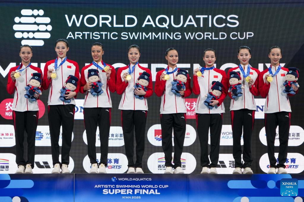 Gold medalists Team China pose on the podium during the awarding ceremony of the team free event at the World Aquatics Artistic Swimming World Cup 2025-Super Final in Xi'an, northwest China's Shaanxi Province,June 14, 2025. (Xinhua/Zou Jingyi)