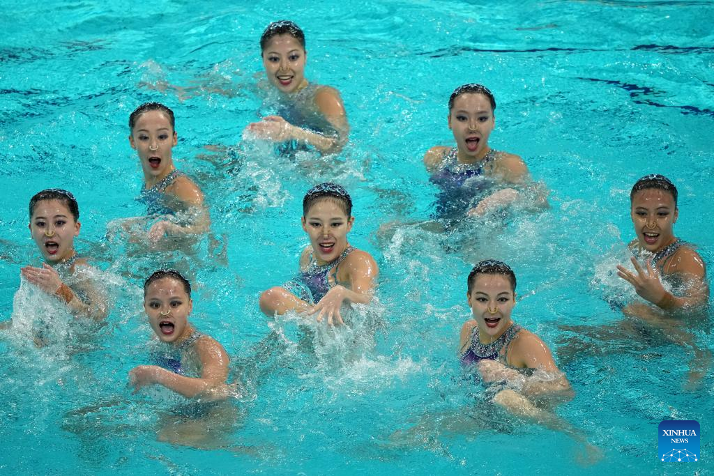 Team China perform during the team free event at the World Aquatics Artistic Swimming World Cup 2025-Super Final in Xi'an, northwest China's Shaanxi Province,June 14, 2025. (Xinhua/Zou Jingyi)
