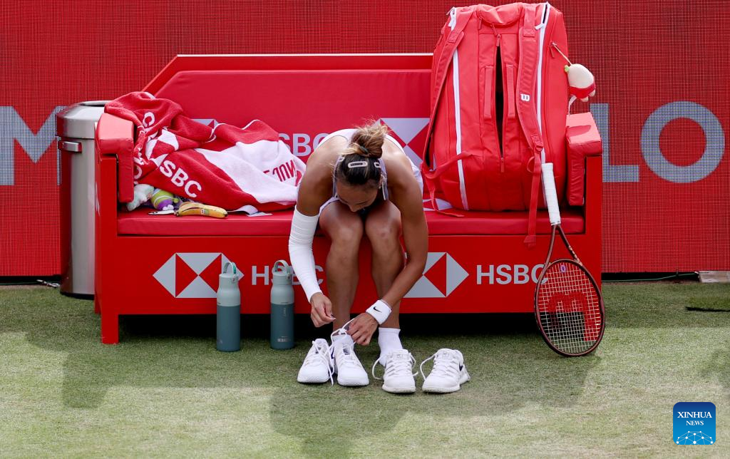 Zheng Qinwen changes shoes during the women's quarterfinal match between Zheng Qinwen of China and Emma Raducanu of Britain at the Queen's Club Championships in London, Britain, June 13, 2025. (Xinhua/Li Ying)