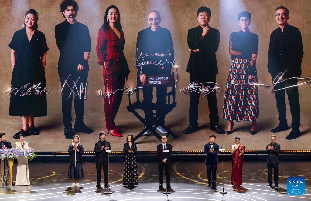 Jury members of the main competition of the Golden Goblet Awards meet the audience during the gala night of the 27th Shanghai International Film Festival (SIFF) in Shanghai, east China, June 14, 2025.