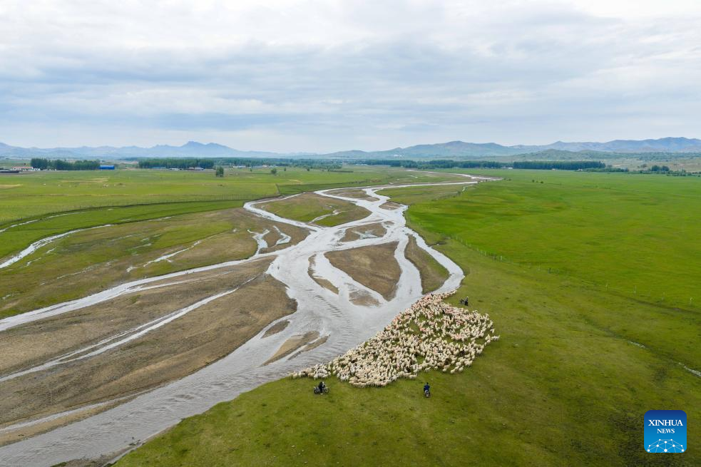 An aerial drone photo shows herdsmen driving sheep across the river at the Ar Horqin Grassland in Chifeng, north China's Inner Mongolia Autonomous Region, June 13, 2025. (Xinhua/Ma Jinrui)