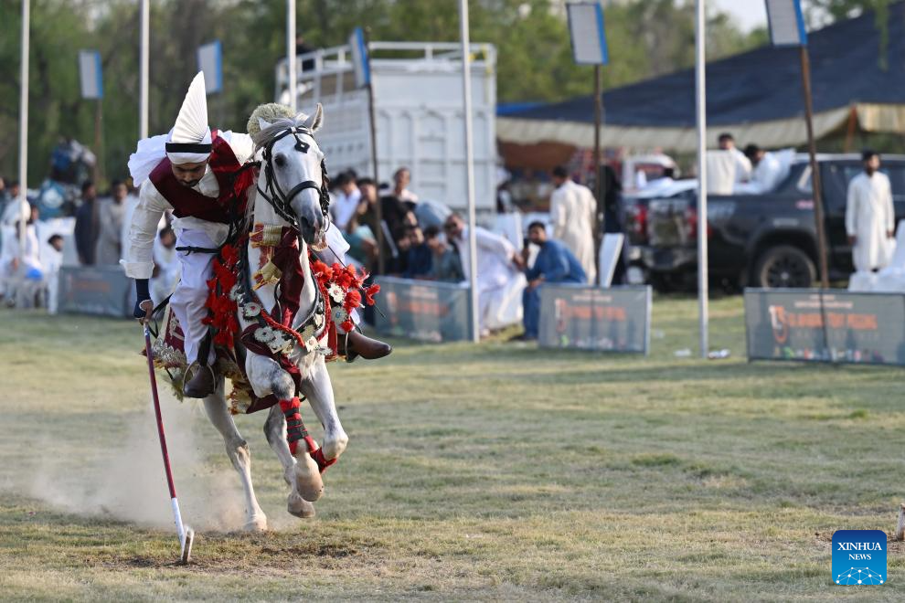 A horseman competes during a tent pegging competition in Islamabad, capital of Pakistan on June 14, 2025.