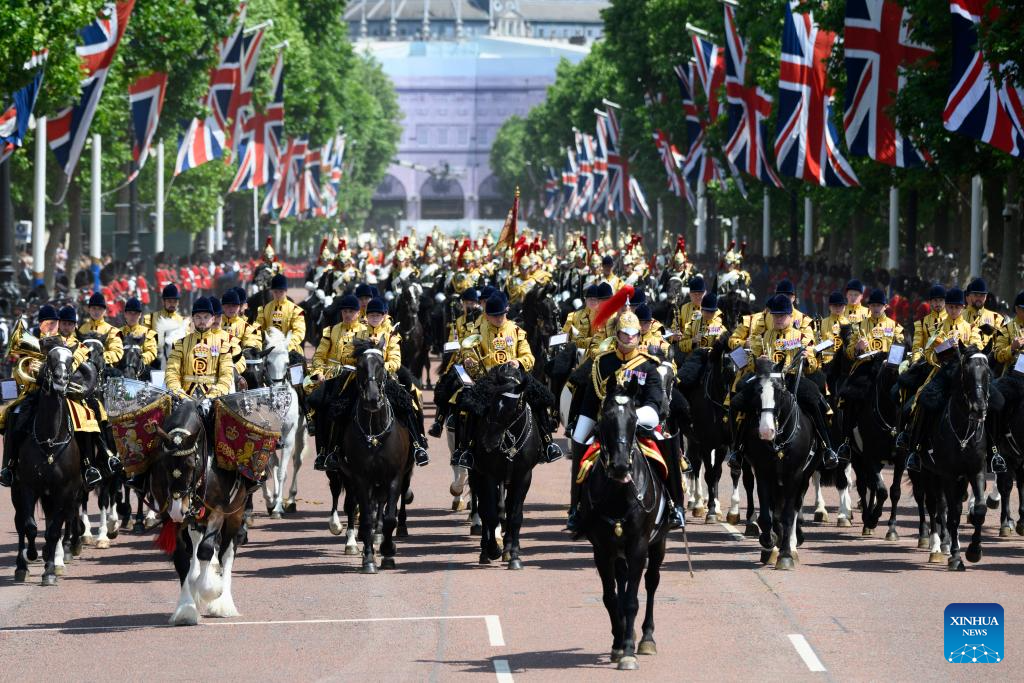 Britain's King Charles III and Queen Camilla attend the Trooping the Colour parade to honour Britain's King Charles III on his official birthday in London, Britain, on June 14, 2025. (Photo by Ray Tang/Xinhua)