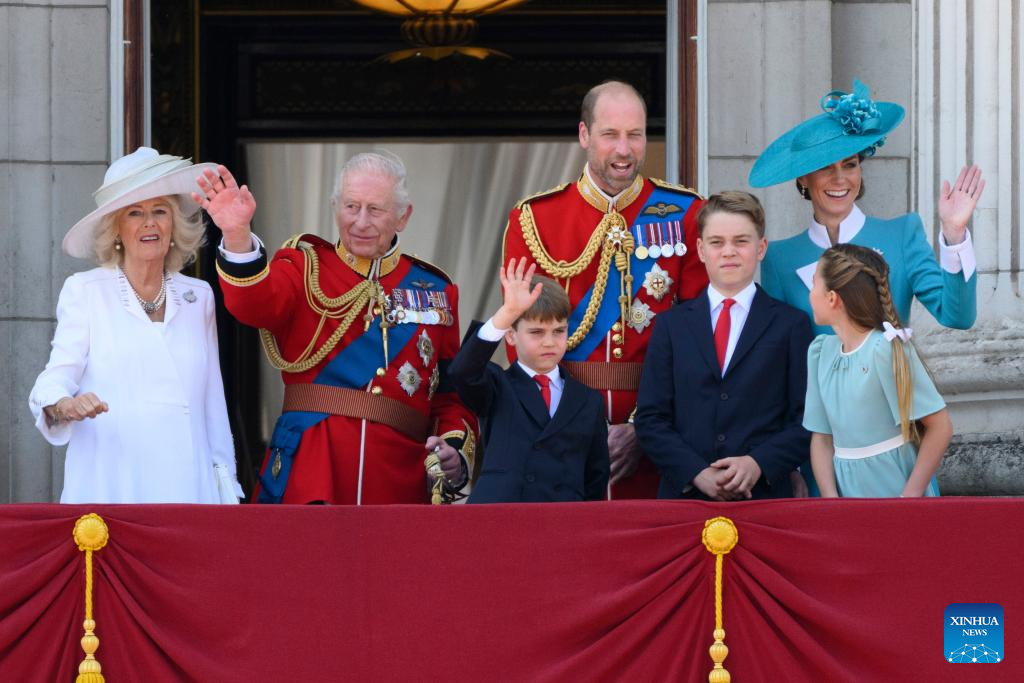 Members of the Royal Family wave to the crowd on the balcony of Buckingham Palace during the Trooping the Colour parade to honour Britain's King Charles III on his official birthday in London, Britain, on June 14, 2025. (Photo by Ray Tang/Xinhua)