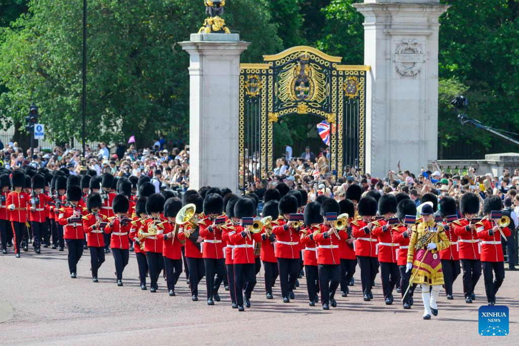Members of the Household Division march during the Trooping the Colour parade to honour Britain's King Charles III on his official birthday in London, Britain, on June 14, 2025. (Photo by Ray Tang/Xinhua)