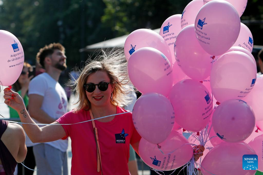 A volunteer offers balloons before the Race for the Cure, a part of an international fund-raising event aiming to fight breast cancer, in Bucharest, Romania, June 15, 2025. (Photo by Cristian Cristel/Xinhua)