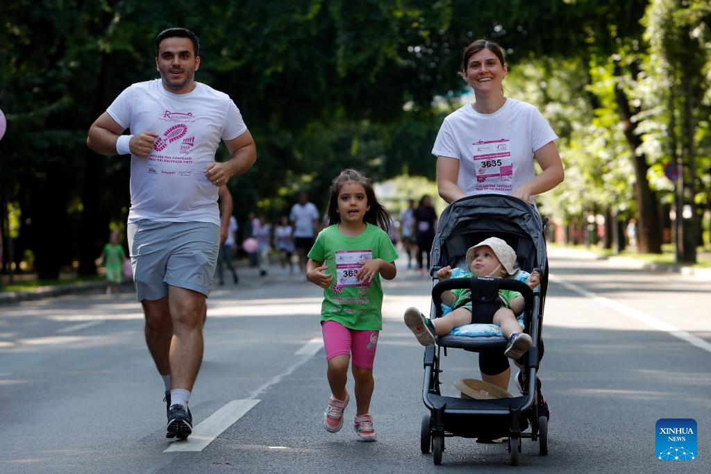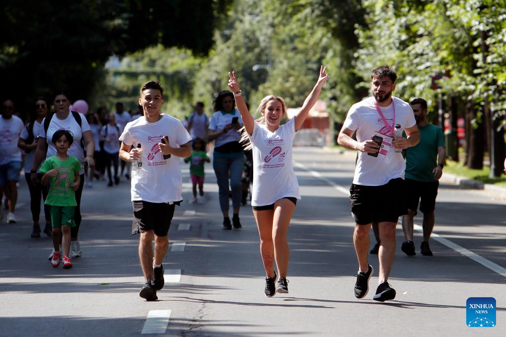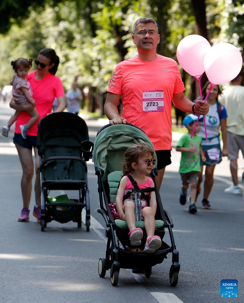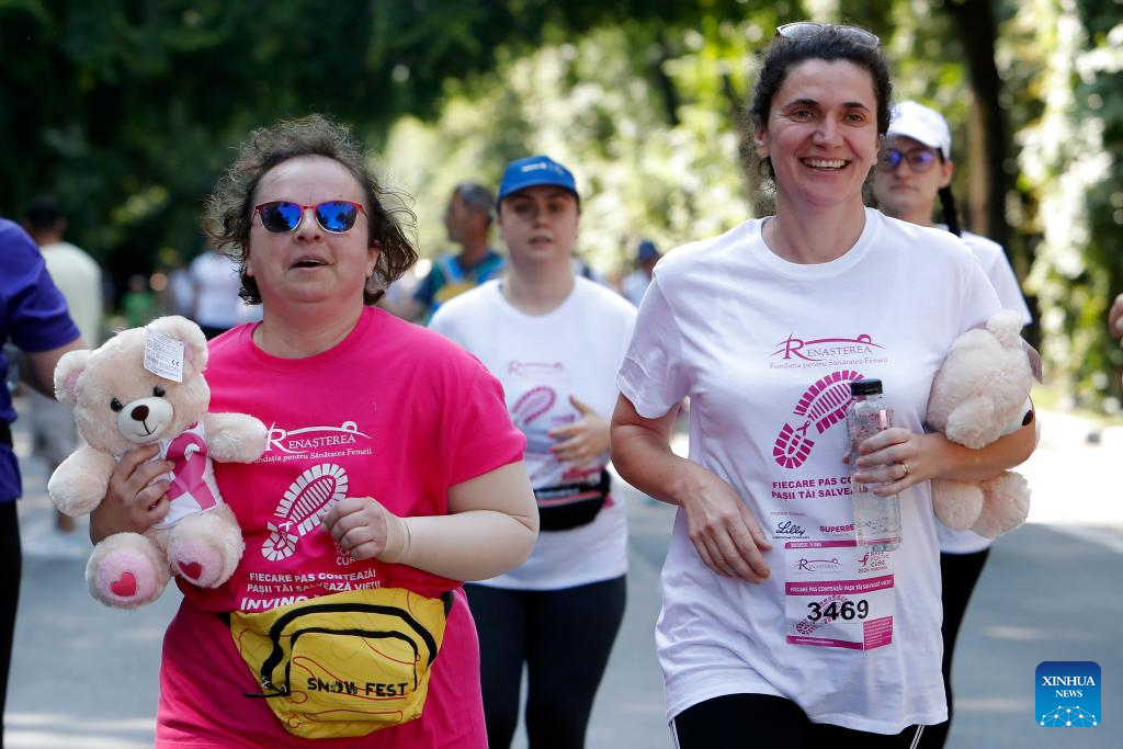 Participants run during the Race for the Cure, a part of an international fund-raising event aiming to fight breast cancer, in Bucharest, Romania, June 15, 2025. (Photo by Cristian Cristel/Xinhua)