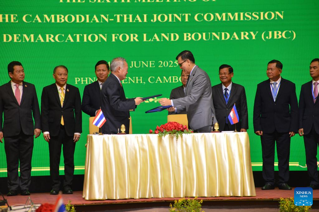 Lam Chea (front, R), Cambodian minister in charge of the State Secretariat of Border Affairs and chairman of Cambodia's Joint Boundary Commission (JBC), and Thai Foreign Ministry advisor Prasas Prasasvinitchai (front, L), who is chairman of Thailand's JBC, exchange the agreed minutes of a Cambodia-Thailand JBC meeting in Phnom Penh, Cambodia on June 15, 2025. (Photo by Phearum/Xinhua)