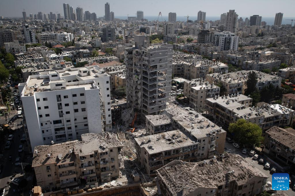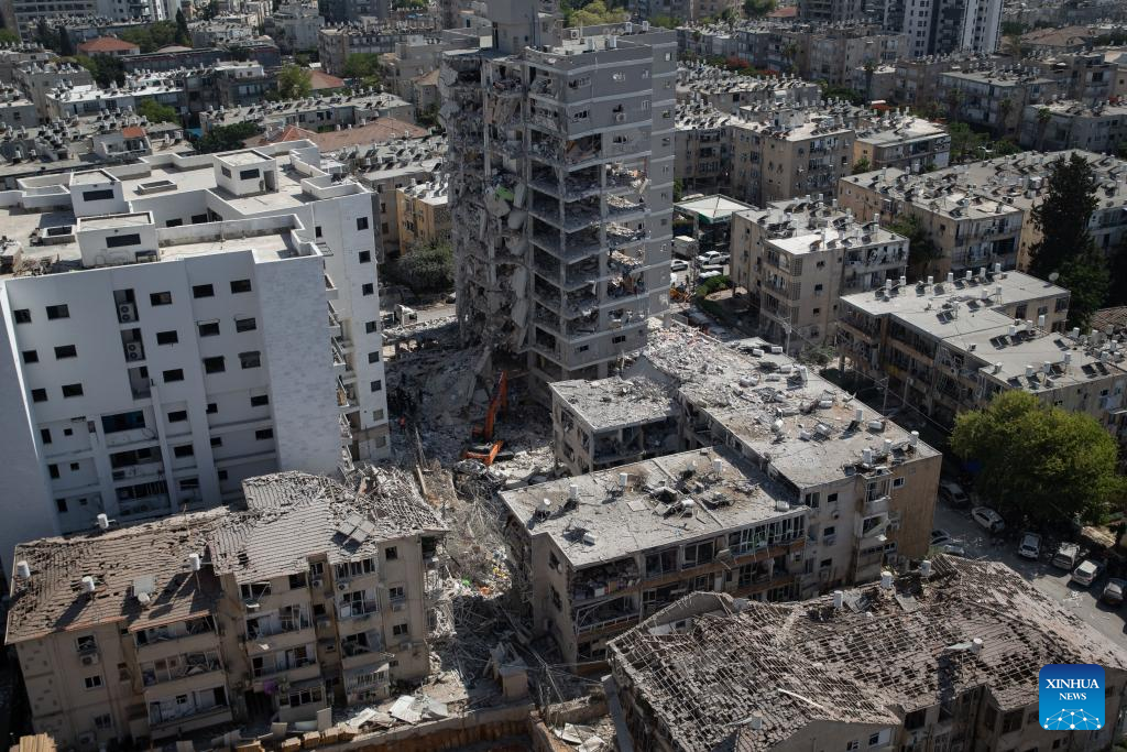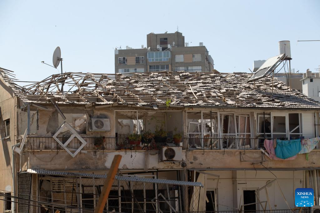 This photo taken on June 15, 2025 shows buildings damaged by a missile fired from Iran in Bat Yam, central Israel. According to Israel's state-owned Kan TV News, the death toll from Iran's strikes since Friday has reached 14. (Xinhua/Chen Junqing)