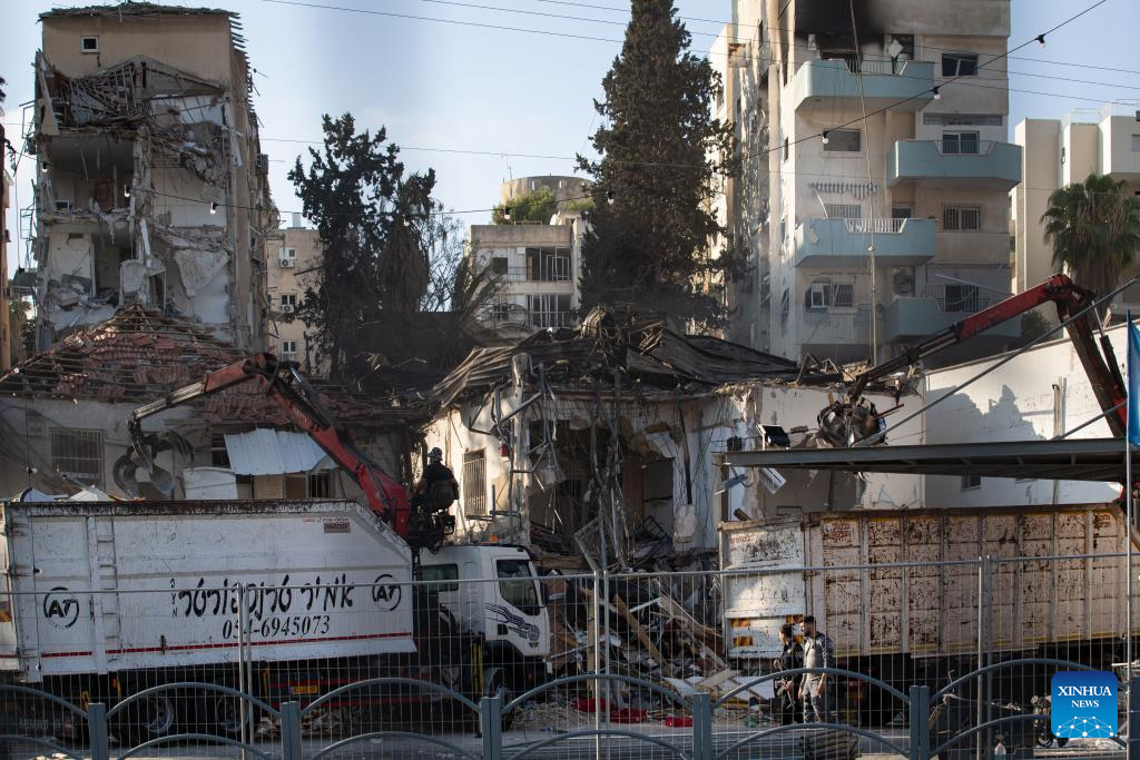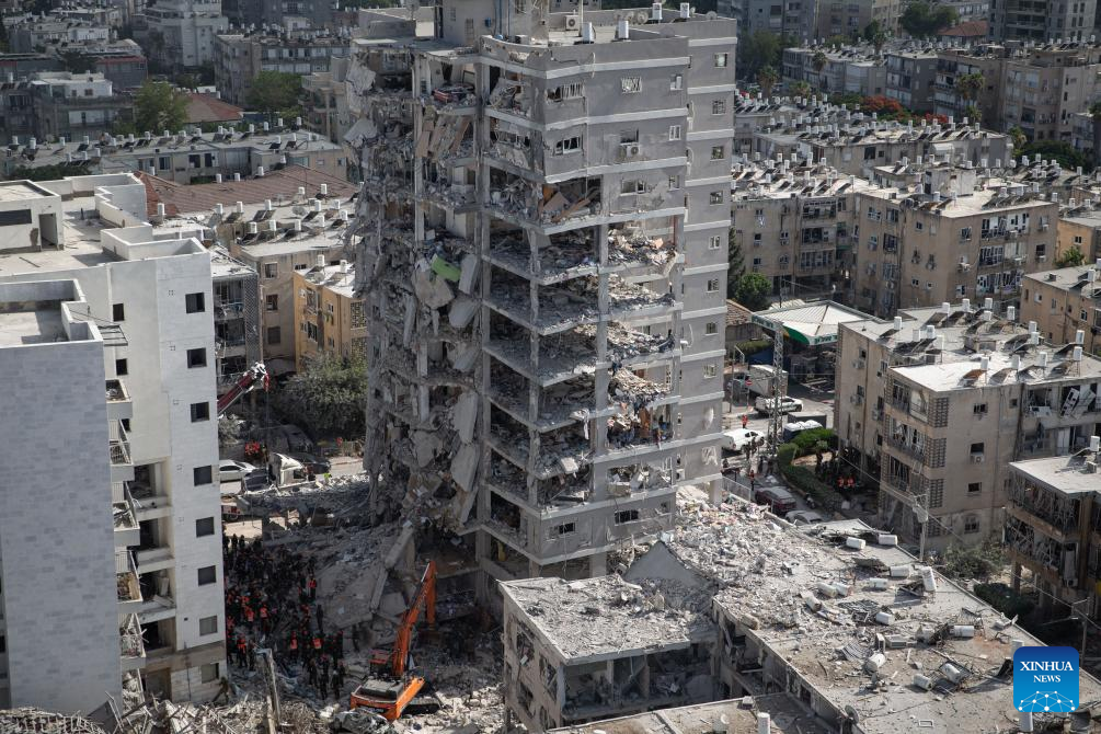 Israeli security and rescue forces work at the scene where buildings were damaged by a missile fired from Iran in Bat Yam, central Israel, on June 15, 2025. According to Israel's state-owned Kan TV News, the death toll from Iran's strikes since Friday has reached 14. (Xinhua/Chen Junqing)