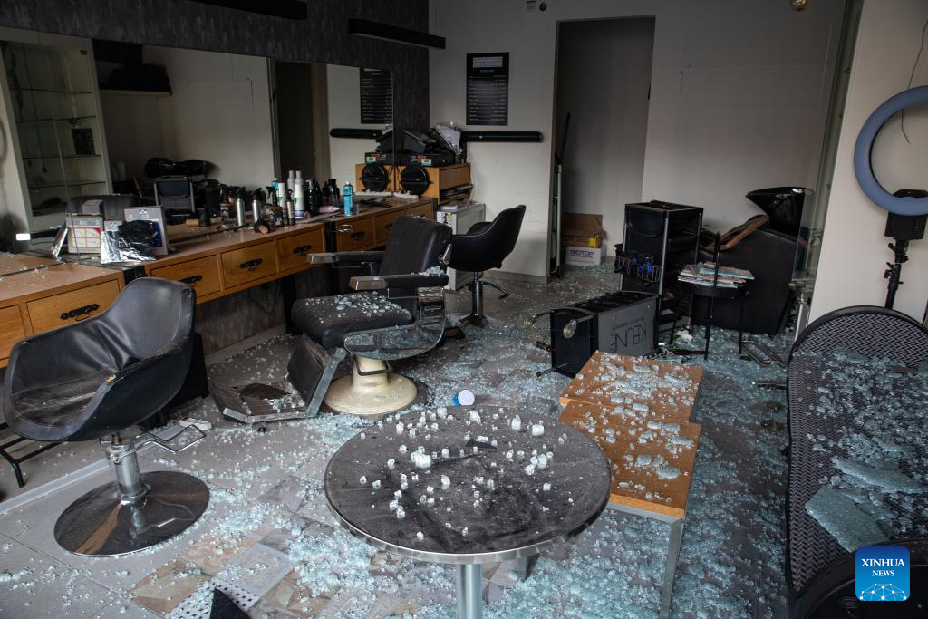 This photo taken on June 15, 2025 shows a barber shop damaged by a missile fired from Iran in Rehovot, central Israel. According to Israel's state-owned Kan TV News, the death toll from Iran's strikes since Friday has reached 14. (Xinhua/Chen Junqing)