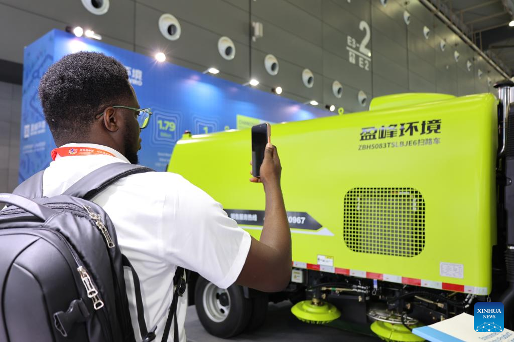 A visitor takes pictures of a sanitation vehicle from Chinese environmental tech firm Infore Enviro during the fourth China-Africa Economic and Trade Expo in Changsha, central China's Hunan Province, June 12, 2025. (Infore Enviro/Handout via Xinhua)