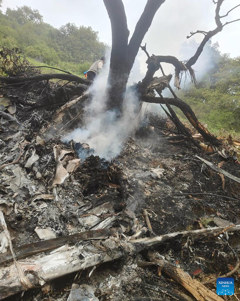 This photo shows the site of a private chopper crash in India's northern hilly state of Uttarakhand on June 15, 2025. Seven people, including two children, the pilot and four male passengers, were dead in the private chopper crash in India's northern hilly state of Uttarakhand early on Sunday, a senior state government official said. (IANS/Handout via Xinhua)