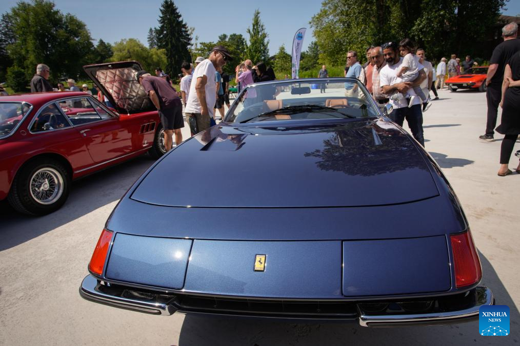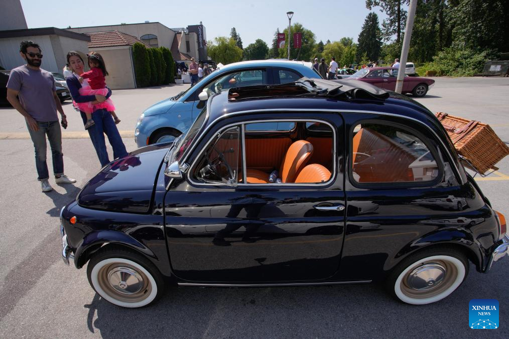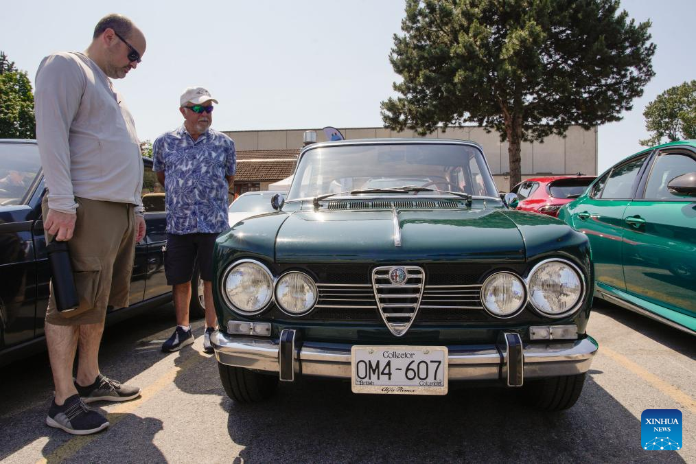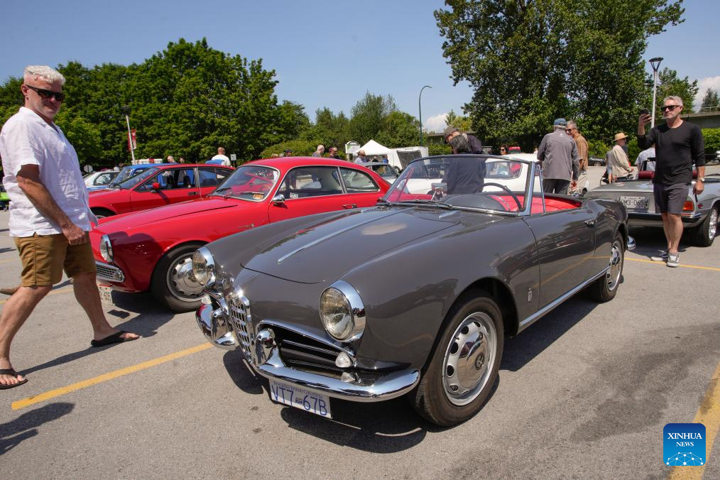 People view a classic car during the "Classica Auto Italiana" event in Vancouver, British Columbia, Canada, June 15, 2025. Featuring over a hundred Italian classic and supercars, the one-day event was held in Vancouver on Sunday. (Photo by Liang Sen/Xinhua)